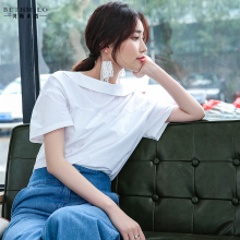 白衬衫女夏季宽松显瘦露肩一字领前后两穿短袖女蝴蝶结性感上衣潮