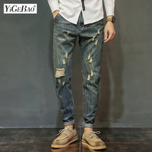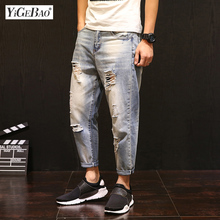 牛仔裤男生裤子春季2017新款百搭潮流男士破洞九分裤子复古哈伦裤