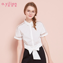 阿依莲夏季新款女装时尚百搭蝴蝶结高腰短款衬衣白色拼网纱衬衫女