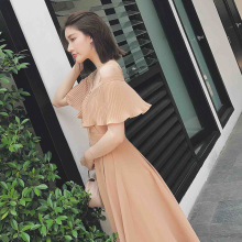 雪纺荷叶边一字领露肩吊带连衣裙夏季女韩版修身显瘦中长裙度假裙