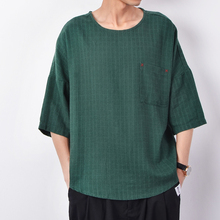 日系复古棉麻宽松七分袖 夏季新款亚麻透气蝙蝠衫短袖t恤潮男上衣