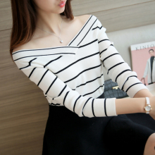 2017秋装新款长袖针织衫韩版上衣条纹修身打底衫V领套头毛衣女