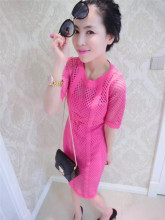 欧洲站2017春新款韩版时尚圆领中长款镂空拼接短袖修身蕾丝连衣裙