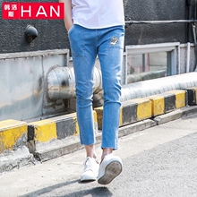 韩洛斯夏季新品浅色破洞牛仔九分裤乞丐牛仔裤男韩版修身小脚裤潮