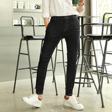 2017韩版夏季男士破洞九分牛仔裤潮流显瘦小脚紧身学生乞丐男裤子