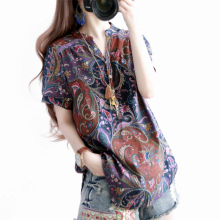 原创特价夏装波西米亚V领短袖荷叶袖宽松棉麻娃娃衫 碎花衬衫上衣
