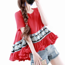 夏装原创设计女装民族风圆领短袖荷叶边雪纺衫 衬衫上衣斗篷