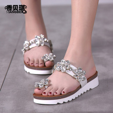2016新款水钻夹趾凉鞋女夏季厚底松糕底平底波西米亚防滑休闲沙滩