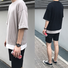 方寸先生夏男落肩宽日系松纯拼接色打底衫自制假两件拼接T恤短袖