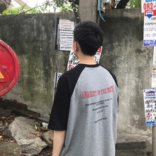 方寸先生夏季新款宽松男撞色拼接螺纹印花男生短袖情侣开叉T恤短