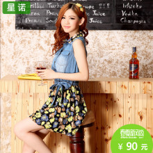 星诺2017春夏女装新款韩版无袖打底雪纺拼接牛仔碎花连衣裙打底裙