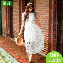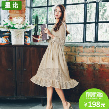 星诺2017春夏季新款中长裙 复古文艺小清新森女系修身蕾丝连衣裙