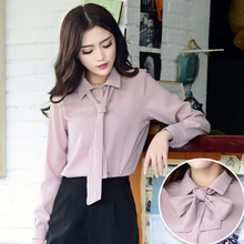 2017春秋新款蝴蝶结翻领长袖领带衬衫女白OL职业工作服打底雪纺衫