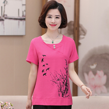 中老年人夏装女棉麻短袖t恤胖妈妈衣服夏装50-60岁宽松全棉上衣