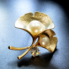 天然珍珠高档韩国锆石小胸针女银杏叶别针大衣装饰领针开衫披肩扣