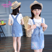 夏装童装儿童背带裙两件套短袖宝宝套裙休闲夏中大童牛仔女童套装