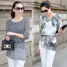2017夏装韩版女装短袖雪纺衬衫百搭圆领中长款宽松条纹上衣潮 衫