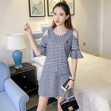 2017夏季新款大码女装格子露肩连衣裙 修身显瘦喇叭袖A字打底短裙