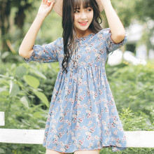 2017夏新款韩版时尚甜美小清新文艺学生短袖中长款雪纺碎花连衣裙