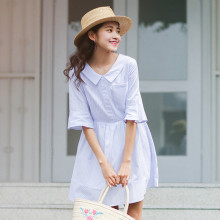 夏季新款韩版学院风甜美小清新中长款娃娃领五分袖条纹连衣裙裙子