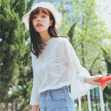 2017文艺小清新雪纺衫女夏季宽松显瘦圆领衬衫百搭喇叭袖上衣学生