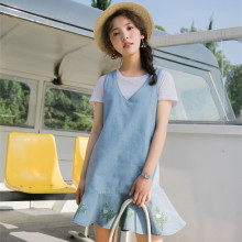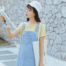 夏季新款小清新花朵刺绣背带牛仔裙学院风甜美宽松百搭连衣裙女潮