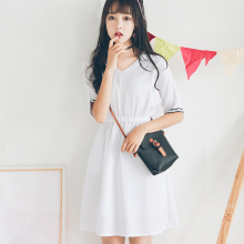 夏季新款2017学院风甜美小清新白色V领连衣裙复古学生中长款裙子