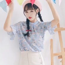 韩版夏装新款甜美喇叭袖碎花雪纺衫小清新印花学院风上衣衬衫女
