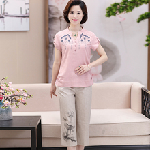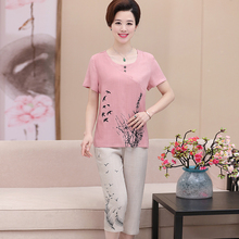 中老年女装夏装两件套大码妈妈装透气棉麻套装短袖T恤+七分裤子