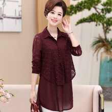 春装新款妈妈装雪纺衫衬衫中年女装拼接蕾丝中长款套头连衣裙