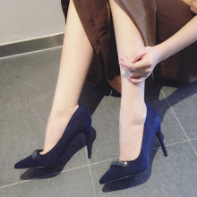 2016秋季新款尖头高跟鞋细跟性感水钻单鞋女百搭蓝色绒面OL女鞋潮