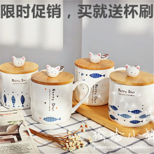 日式Zakka创意猫咪和鱼群马克陶瓷杯子卡通带勺带盖早餐牛奶水杯