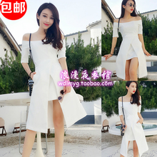 2016夏季新款女装时尚大牌气质性感一字领露肩修身显瘦开叉连衣裙