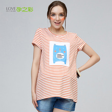 孕之彩孕妇上衣夏短袖孕妇装纯棉孕妇T恤条纹孕妇中长款上衣