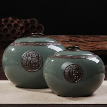 东茶西壶 青瓷开片茶罐陶瓷密封罐 哥窑茶叶罐 哥窑浮雕福字圆罐
