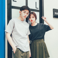 2017夏季新款韩版简约个性黑灰学生情侣装圆领短袖T恤打底衫女潮