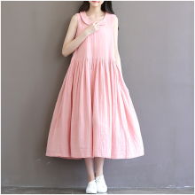 2017春夏新款文艺复古纯色娃娃领无袖棉麻连衣裙长裙