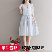 2017春夏新款森女系文艺复古大码宽松圆领中长款纯色五分袖连衣裙