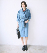 2015秋季欧美风大牌时尚显瘦系带收腰大口袋中长款纯色牛仔外套女