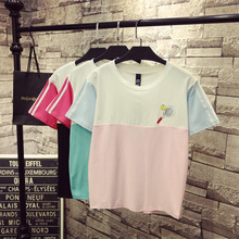 2017夏季新款可爱拼接撞色短袖T恤女宽松韩版学生小清新百搭上衣