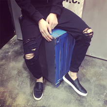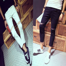 les帅t林弯弯韩版修身小脚裤膝盖破洞牛仔裤显瘦乞丐裤长裤男潮