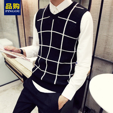 春装男士圆领毛衣马甲潮男格子针织背心青少年修身套头无袖打底衫