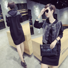 连帽上衣2016韩版时尚中长款孕妇裙 牛仔拼接假两件套孕妇连衣裙