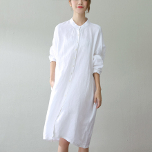 可然 等日落/立领棉麻白色衬衫裙女长袖中长款 文艺宽松大码女装