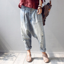 可然 自在/文艺范宽松破洞牛仔裤 原创低裆休闲哈伦裤女春夏 包邮