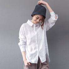可然 清澈/文艺范白衬衫女夏 长袖宽松亚麻衬衣 棉麻女装防晒上衣
