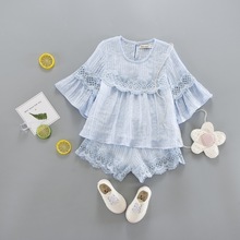 2017韩国童装新款 棉麻蓝色短袖上衣+阔腿短裤两件套 女童套装