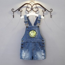 塔塔童品 2016夏女童笑脸背带牛仔短裤 五分背带裤 破洞牛仔短裤
