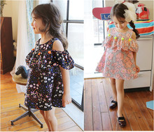 韩国正版 品质童装 2017夏款女童露肩碎花荷叶边流苏连衣裙