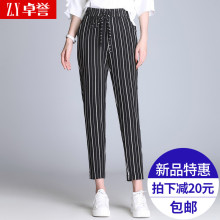 黑白条纹裤子女2017新款韩版九分裤女黑色显瘦小脚裤松紧腰哈伦裤